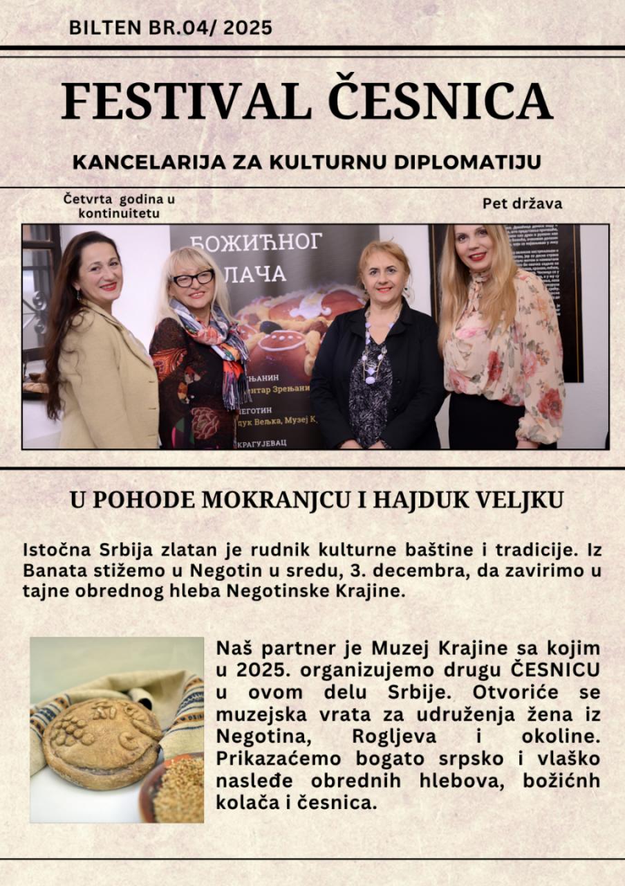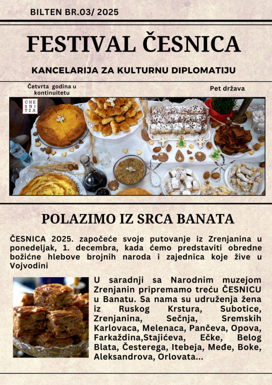 Kancelarija za kulturnu diplomatiju ove godine po četvrti put organizuje Festival božićnog kolača ČESNICA 2025  u saradnji sa brojnim institucijama kulture poput Muzeja Krajine, Narodnog muzeja Šumadija, Narodnog muzeja Zrenjanin, Muzeja Republike Srpske, Galerije „Sreten Stojanović“ Prijedor, Doma kulture Gračanica i drugih. Festival je uspostavljen kao platforma koja spaja muzeje i lokalna udruženja žena na zajedničkom zadatku – očuvanju i promociji kulturnog nasleđa u oblasti obrednog hleba. Hleb – najveći zajednički imenitelj evropskih naroda  Obredni i kultni hlebovi neprocenjivo su blago koje živi u brojnim kulturama hiljadama godina. Obredni hlebovi mese se, lome, jedu, dele i prinose kao žrtva. Oni predstavljaju apotropejone (zaštitnike) u mnogim situacijama koje zajednica smatra važnim događajima životnog[...]